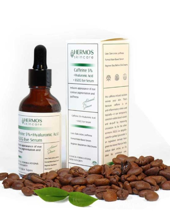 سرم دور چشم کافئین هرموس ماده ای به نام کافئین وجود دارد که می تواند مویرگ های خونی را منقبض کند. استفاده از این ماده به صورت موضعی بر روی ناحیه پف کرده زیر چشم باعث تنگ شدن مویرگهای خونی زیرپوست شده و به آرامی ورم را از بین می برد.