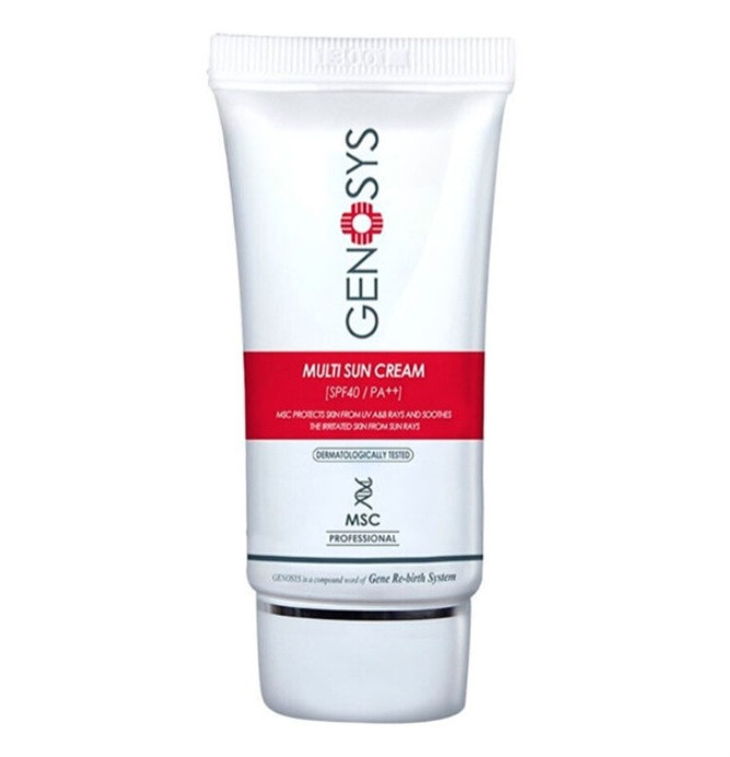 کرم ضد آفتاب MULTI SUN ژنوسیس ساخت کشور کره جنوبی یکی از کاربردی ترین ضد آفتاب های چند منظوره جهت استفادهی عموم و متخصصان پوستی است. این ضد آفتاب علاوه بر حفاظت از پوست در برابر اشعه های مضر خورشید، خاصیت آبرسانی، تسکین دهندگی و التیام بخشی دارد که آن را برای استفاده بعد از درمان های تهاجمی نظیر میکرونیدلینگ و آر اف فرکشنال، اسیدتراپی و… مناسب میکند. استفاده از کرم های ضد آفتاب در هر شرایط بسیار مفید است. در هوای آلوده و در شرایط افزایش اشعهی UV به خصوص در روز های آفتابی، ضد آفتاب را به اندازهب دو بند انگشت رو صورت اعمال کنید و هر ۲ ساعت آن را تمدید کنید.